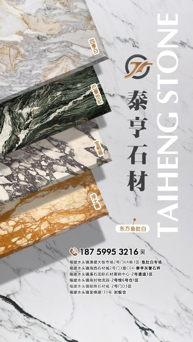 泉州泰亨石材有限公司,辦公地點位于中國石材之都—南安水頭。經(jīng)營產(chǎn)品有:東方魚肚白(自有礦山),四季白,巴黎世紀(jì),寶格麗,浮士德,布達(dá)拉灰(自有礦山),星空灰(自有礦山)、雅蘭云天(包礦)、蘋果灰(包礦)、銀鉆咖啡(包礦)、魚肚白、雪花白、藍(lán)金沙白金沙系列、帕斯高灰、意大利木紋、意大利,西班牙原裝進(jìn)口巖板(中國總代理)、國產(chǎn)巖板(福建總代理)、黃斑石、意大利木紋、銀鉆咖啡,魚肚灰等優(yōu)質(zhì)品種。我們以經(jīng)驗豐富的采購團(tuán)隊,熱情專業(yè)的銷售團(tuán)隊和執(zhí)著細(xì)致的技術(shù)團(tuán)隊,為客戶提供精致的產(chǎn)品,售前售后服務(wù)和技術(shù)支持。本著為客戶負(fù)責(zé)的態(tài)度,經(jīng)過多年的潛心經(jīng)營,泰亨石材在石材業(yè)界樹立了良好的信譽(yù)。如果您對我司的產(chǎn)品服務(wù)有興趣,歡迎在線留言或來電來函咨詢,泰亨石材在追求美的路上與您一路同行。