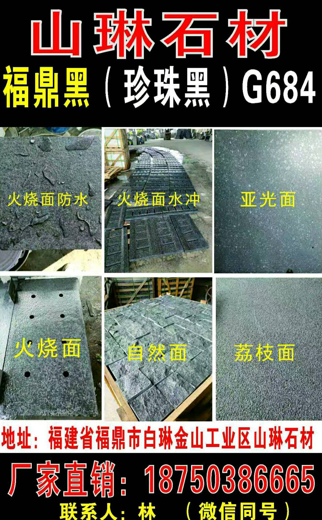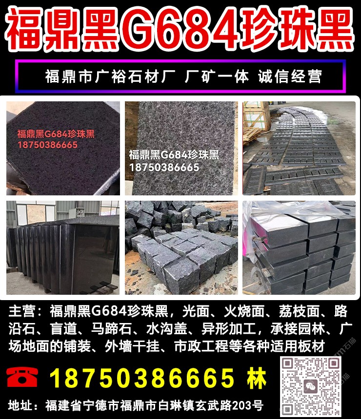 主營:福鼎黑G684、珍珠黑、芝麻黑G654,光面、荔枝面、火燒面、馬蹄石、盲道等。異型加工,承接經(jīng)營:市政園林,廣場地鋪,外墻干掛等各類適用板材