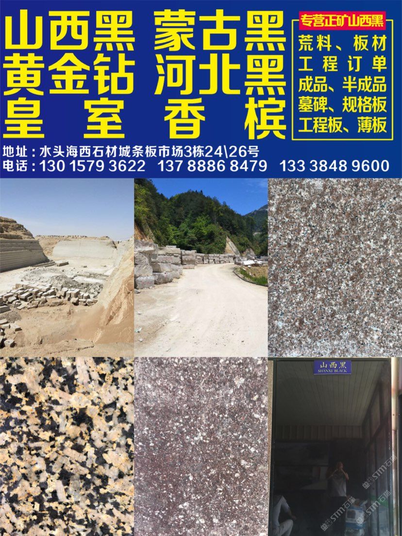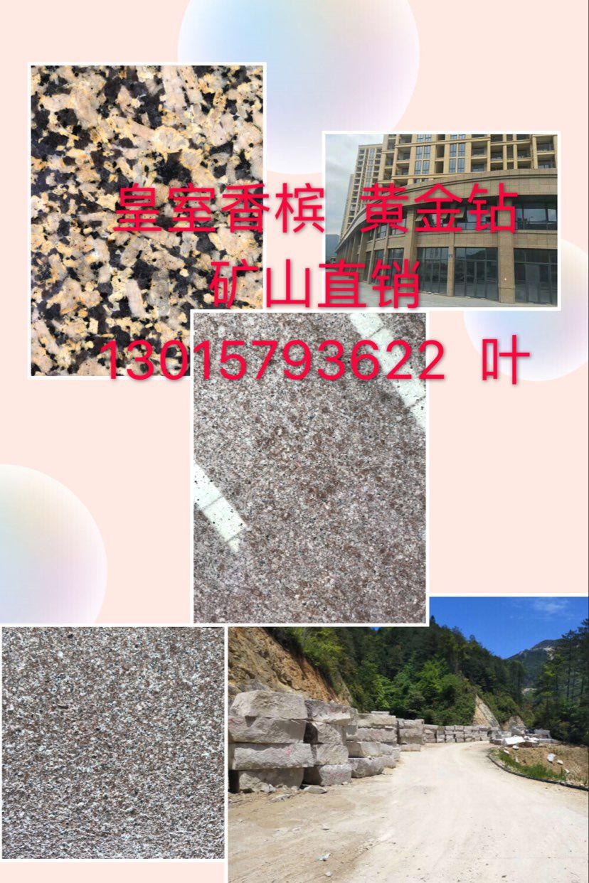 本公司主要經(jīng)營(yíng) 皇室香檳 黃金鉆/金鉆麻 山西黑 河北黑 壽寧紅/雞血紅 國(guó)產(chǎn)皇室啡 荒料 板材 工程訂單 園林景觀訂單 碑石半成品 成品