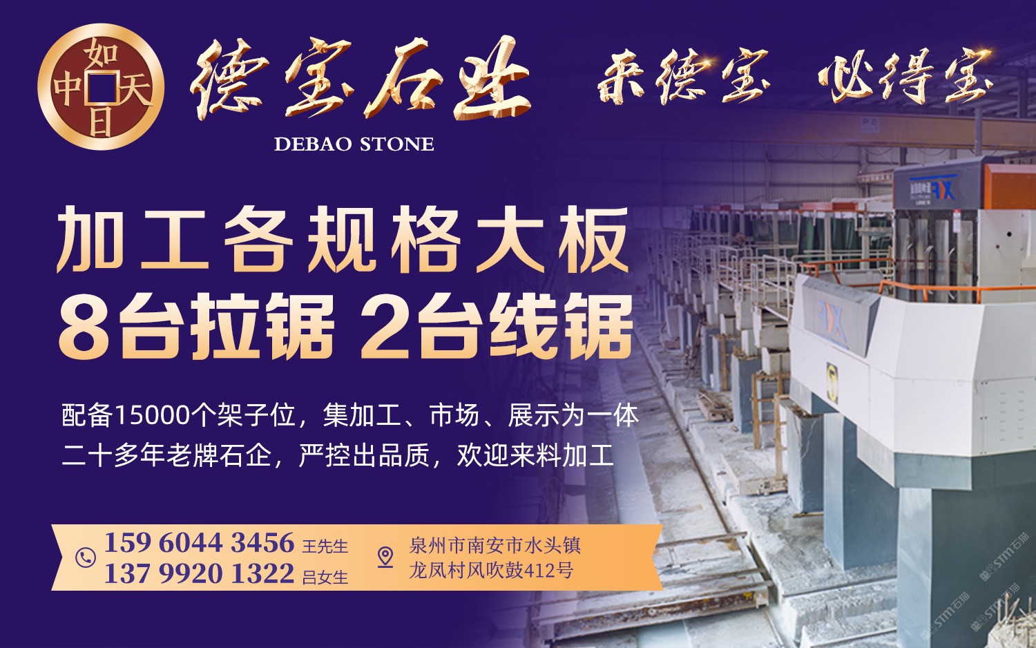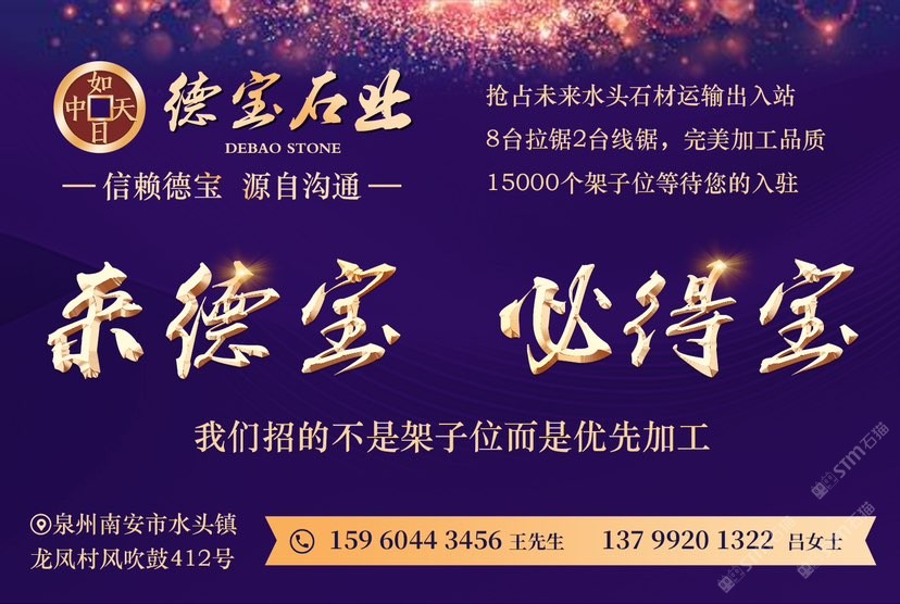 德寶大理石專業(yè)加工各規(guī)格大板,8臺(tái)拉鋸2臺(tái)線鋸,配備15000個(gè)架子位,是一家集加工、市場(chǎng)、展示為一體的二十多年老牌石企,嚴(yán)控出品質(zhì),歡迎來(lái)料加工!