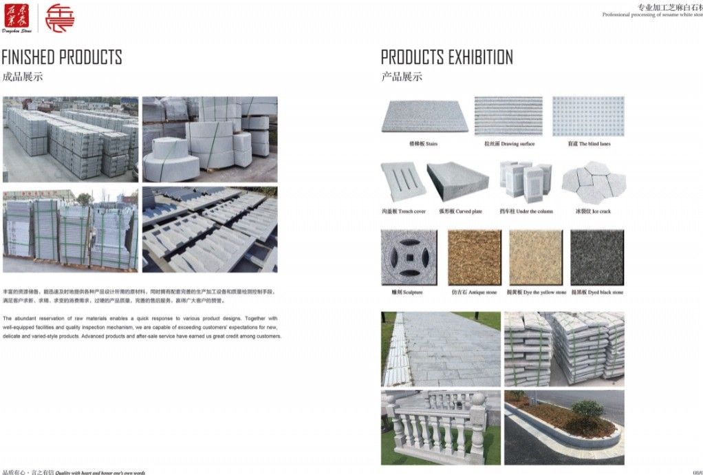 主營:承接高鐵機場、外墻干掛、廣場別墅、市政工程和外貿(mào)出口等各種工程板。 主營芝麻白G603、芙蓉白G602火燒面、光面、荔枝面、斧剁面、噴砂面、拉絲面、菠蘿面,水溝蓋板、雕刻板、路沿石、蘑菇石、擋車石、馬蹄石、冰裂紋、圓球、染色板等
