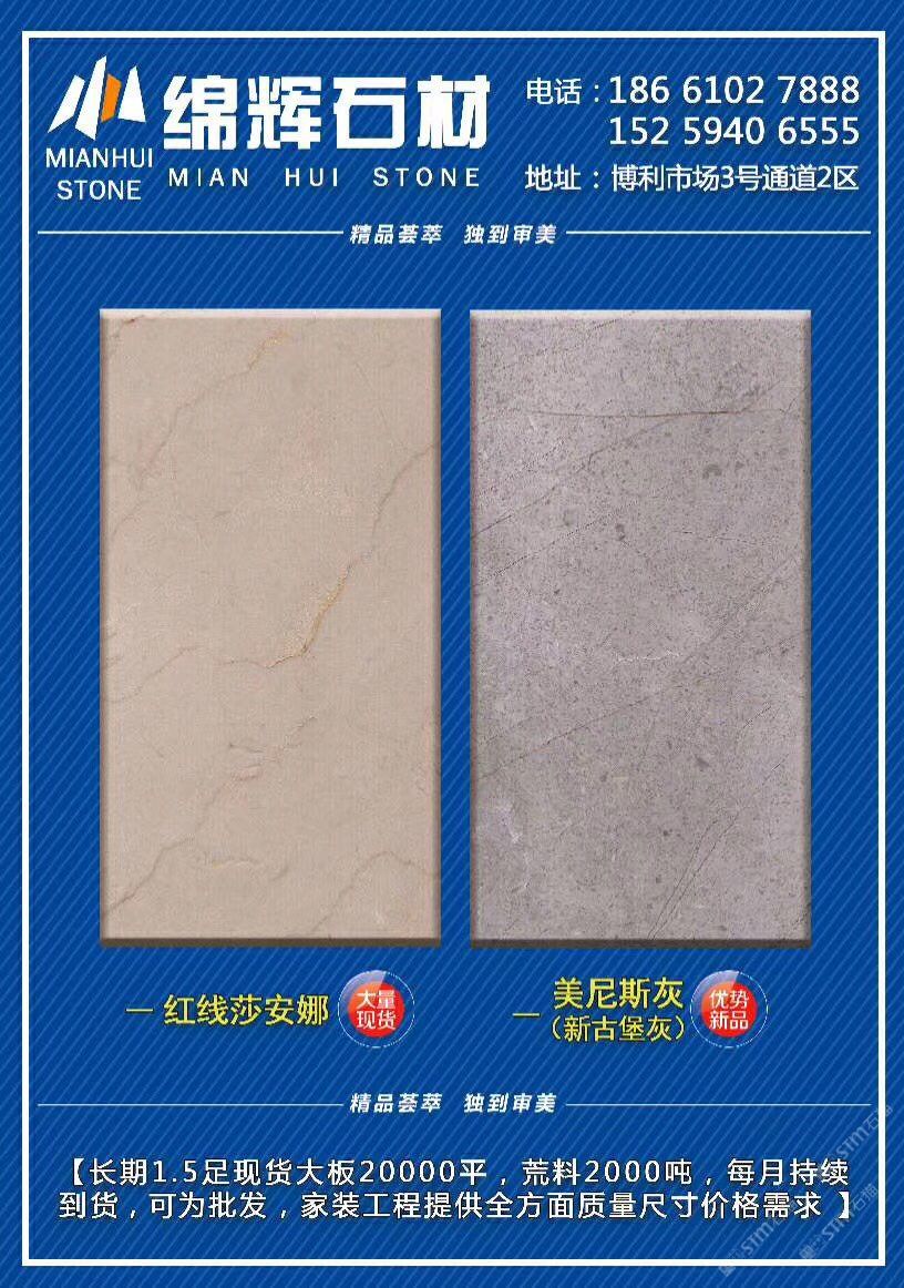發(fā)布信息: 主營:《紅線莎安娜》《美尼斯灰·新古堡灰》 ??長期現(xiàn)貨兩萬平走量不走價(jià),超值特惠90元起?? [發(fā)]另有3500平《金歐典》品種清倉揮淚甩賣[發(fā)] 地址:福山工業(yè)區(qū)博利大板市場(chǎng)3通道2區(qū) 致富熱線:13004819222李