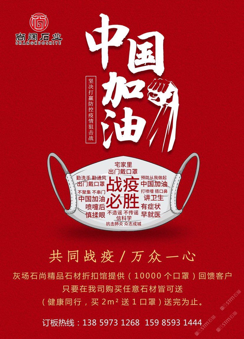 發(fā)布信息: 眾志成城,抗擊疫情! ??????????? 灰場(chǎng)石尚折扣館提供10000個(gè)口罩回饋客戶[愉快] 只要在我司購(gòu)買(mǎi)任意石材皆可送(健康同行,買(mǎi)2m2送1口罩)送完為止。 咨詢(xún)電話:15985931444