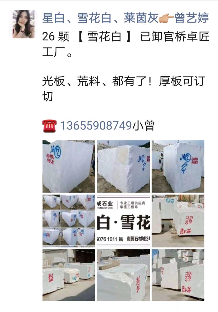 發(fā)布信息: 【 雪花白 】 荒料 : 馬上要安排下單切嘍 需要荒料、厚板 的來 現(xiàn)貨1.8cm 放在南翼石材城三號門四號倉三區(qū)