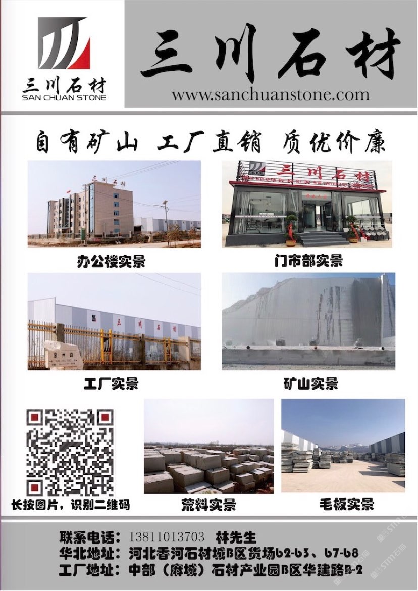 北京三川豐澤石材有限公司 聯(lián)系人:林勇    138****3703 查看 手機號碼:無 主營范圍: 礦山、花崗巖加工、大板批發(fā)、環(huán)境石材、荒料、 企業(yè)地址:北京北京通州區(qū)三川石材