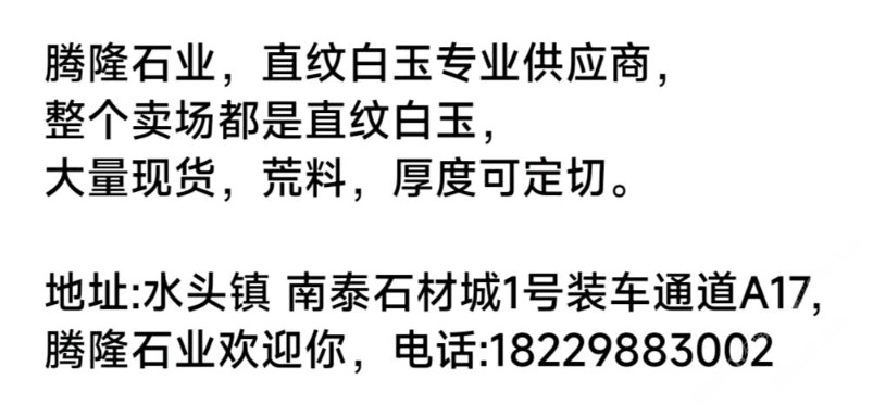 發(fā)布信息: 整個(gè)賣(mài)場(chǎng)都是直紋白玉, 歡迎各位朋友前來(lái)選購(gòu)?? 騰隆石業(yè)——直紋白玉供應(yīng)商 南泰石材城1號(hào)通道A17 聯(lián)系電話:13599988860, 18229883002