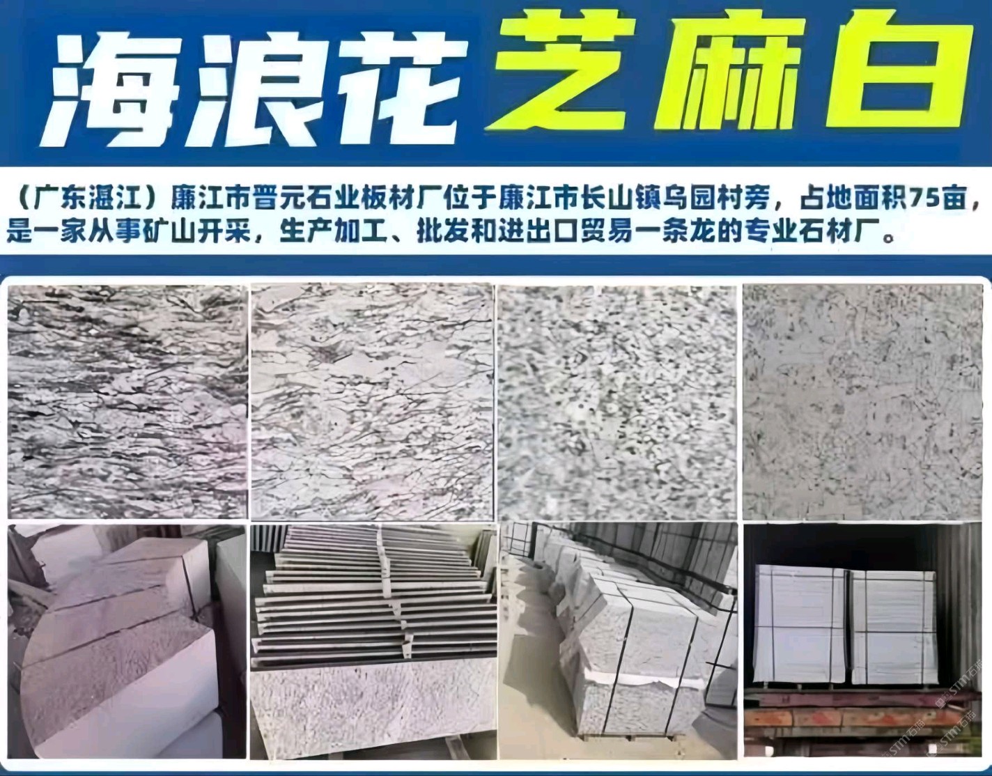 發(fā)布信息: 本廠主要生產(chǎn)加工芝麻灰、芝麻白(廉江白麻)、海浪花(浪花白)等,可加工火燒面、荔枝面、光面、自然面、蘑菇面、路沿石、墓碑石及其它異形加工等。13809732891/13827182913林經(jīng)理