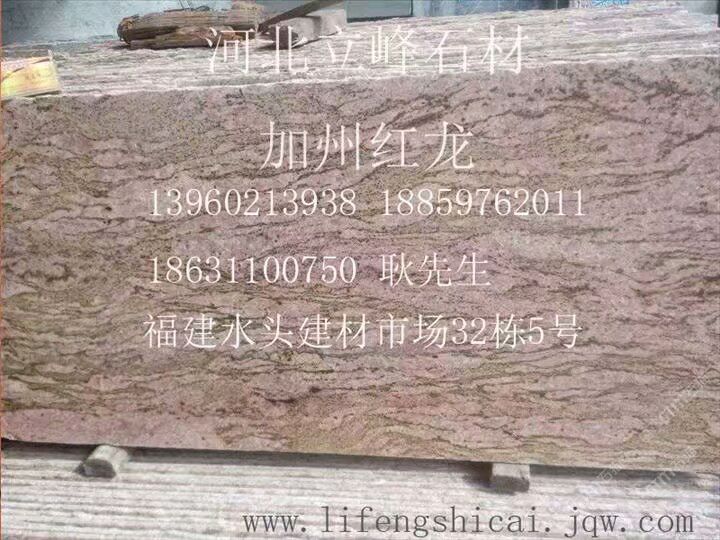 發(fā)布信息: 加州紅龍全球供應(yīng)商,雪浪石,小米黃,黑白山水石。電話13960213938微信同號(hào)。地址,水頭建材市場(chǎng)32棟15號(hào)。海西建材市場(chǎng)11棟10號(hào)。水頭工廠地址,建材市場(chǎng)對(duì)過,銘亮石材廠?;牧?,海西荒料市場(chǎng)2號(hào)倉1號(hào)吊下邊。廠址河北省石家莊市靈壽縣東木佛橋北100米路西。河北荒料,石家莊市靈壽縣南紀(jì)城港源物流。